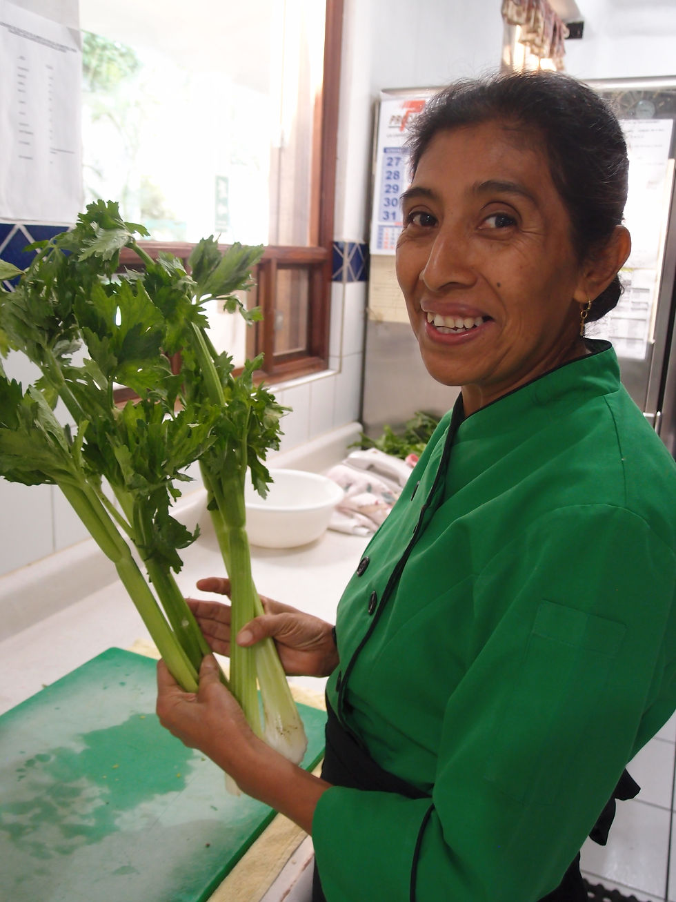 Today we are in the Common Hope kitchen making a very tasty traditional Guatemalan dish called Jocon [huh-cone]. Jocon is a blended green chicken stew, made from tomatillos, green tomatoes, green peppers, and a variety of other green vegetables like celery and broccoli. Jocon is typically served with rice and tortillas. It is a favorite of the Common Hope staff, and of many people in Guatemala. Don’t let the green color fool you — this dish is rich, comforting, and oh-so-yummy! Give it a try! ¡Buen provecho!